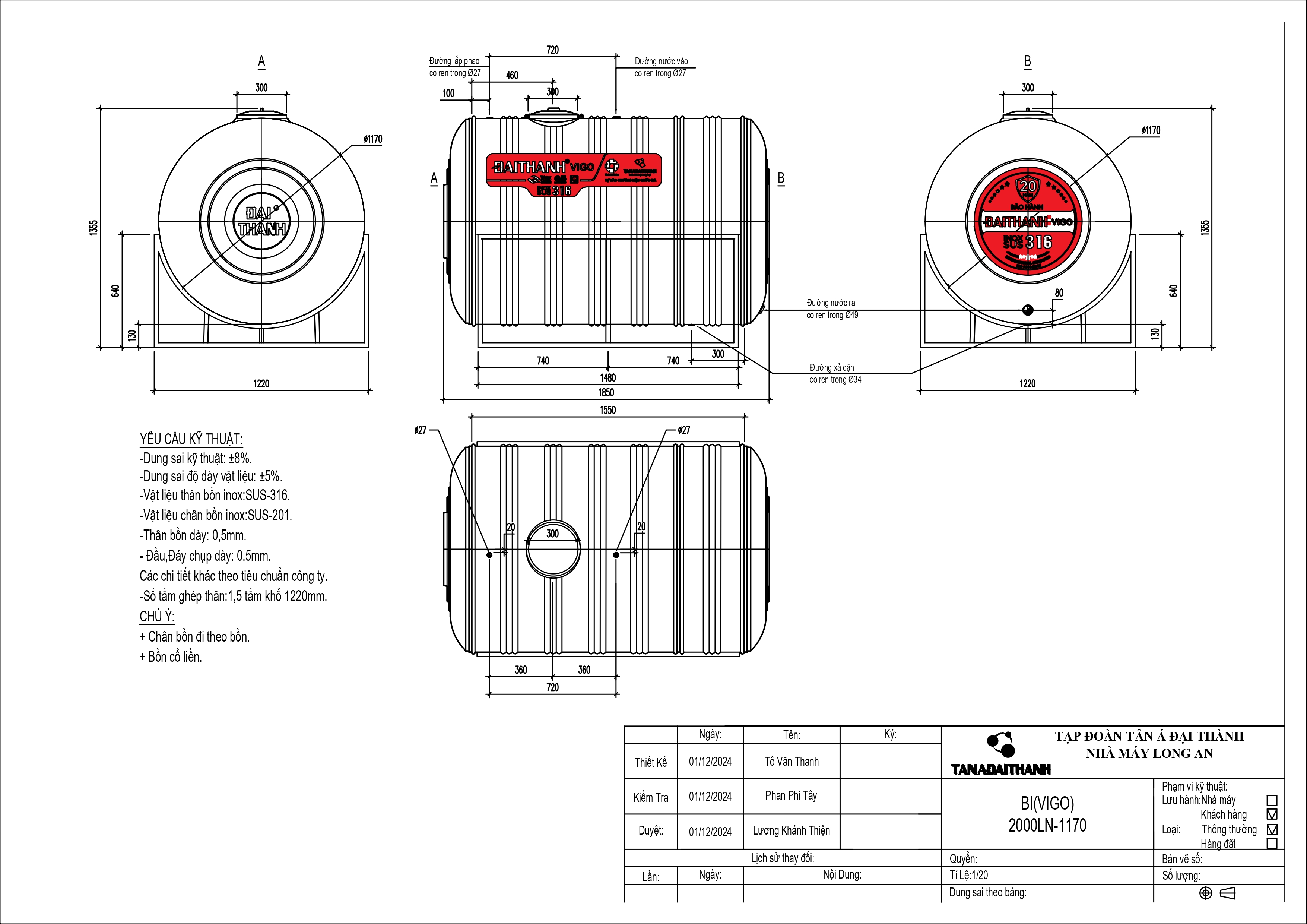 • Thời Gian Bảo Hành: Bồn Inox SUS 316 Đại Thành được bảo hành lên đến 20 năm