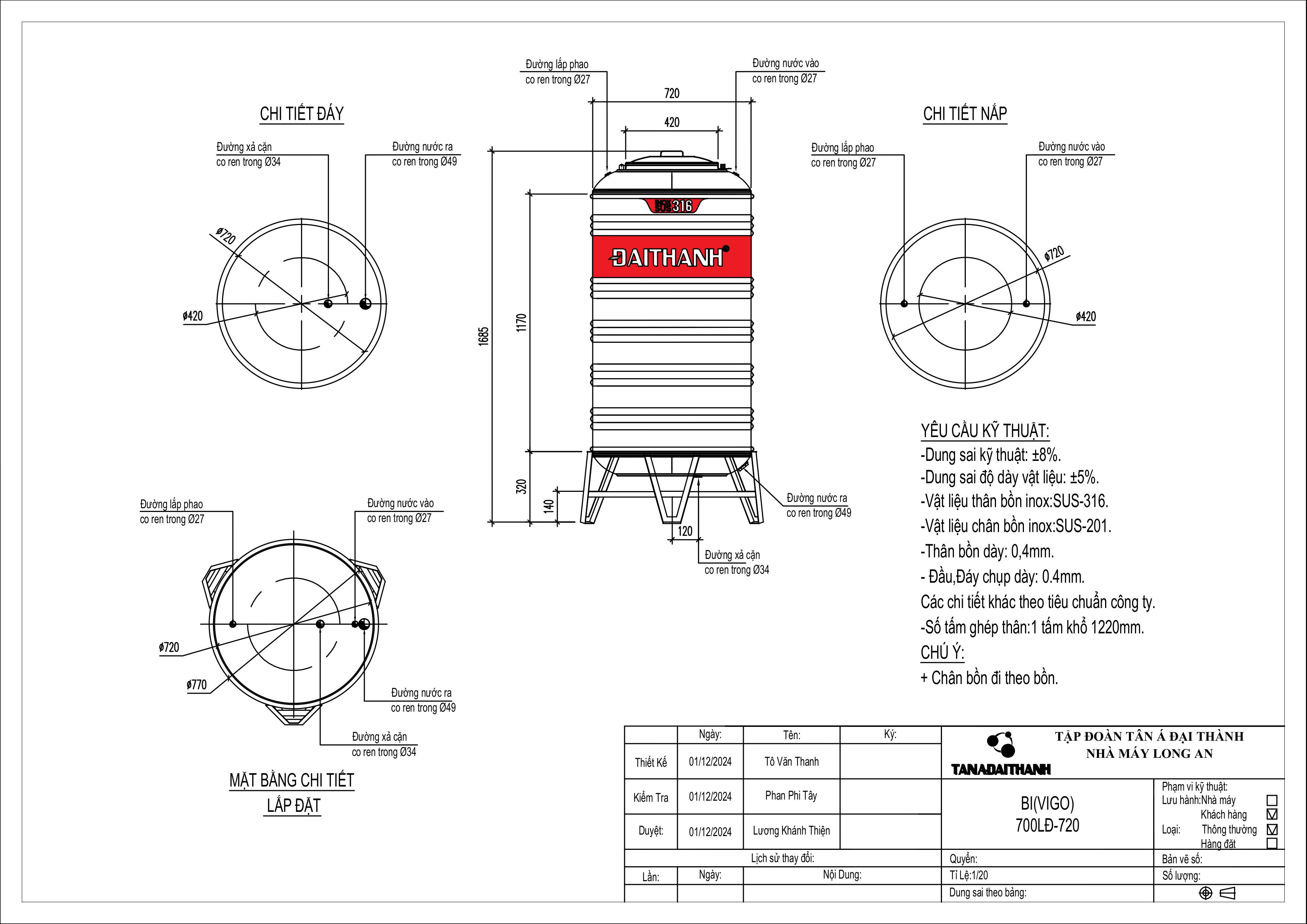 BỒN INOX 316 ĐẠI THÀNH 700L ĐỨNG