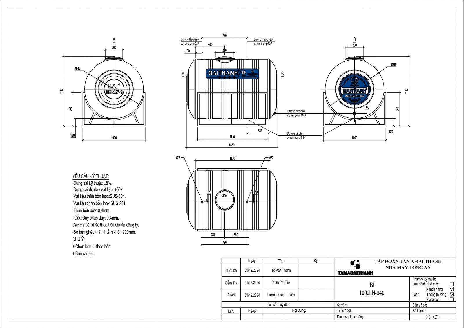 BỒN INOX ĐẠI THÀNH 1.000L NGANG