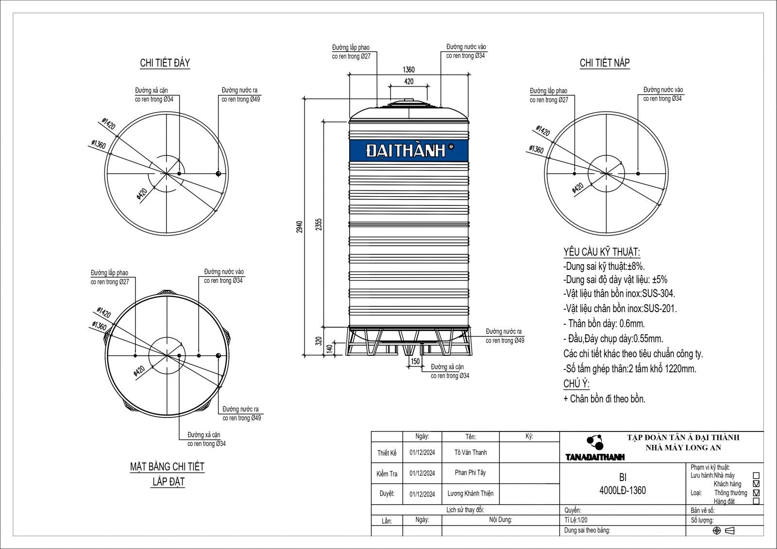 BỒN INOX ĐẠI THÀNH 4.000L ĐỨNG