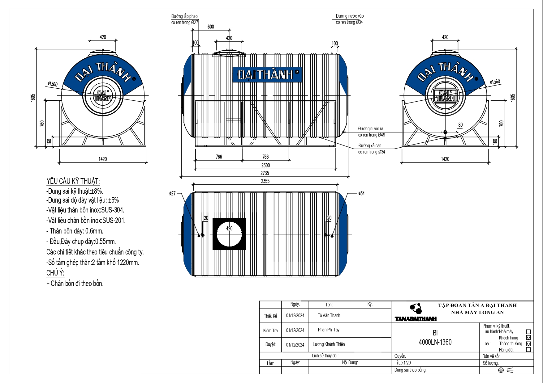 BỒN INOX ĐẠI THÀNH 4.000L NGANG