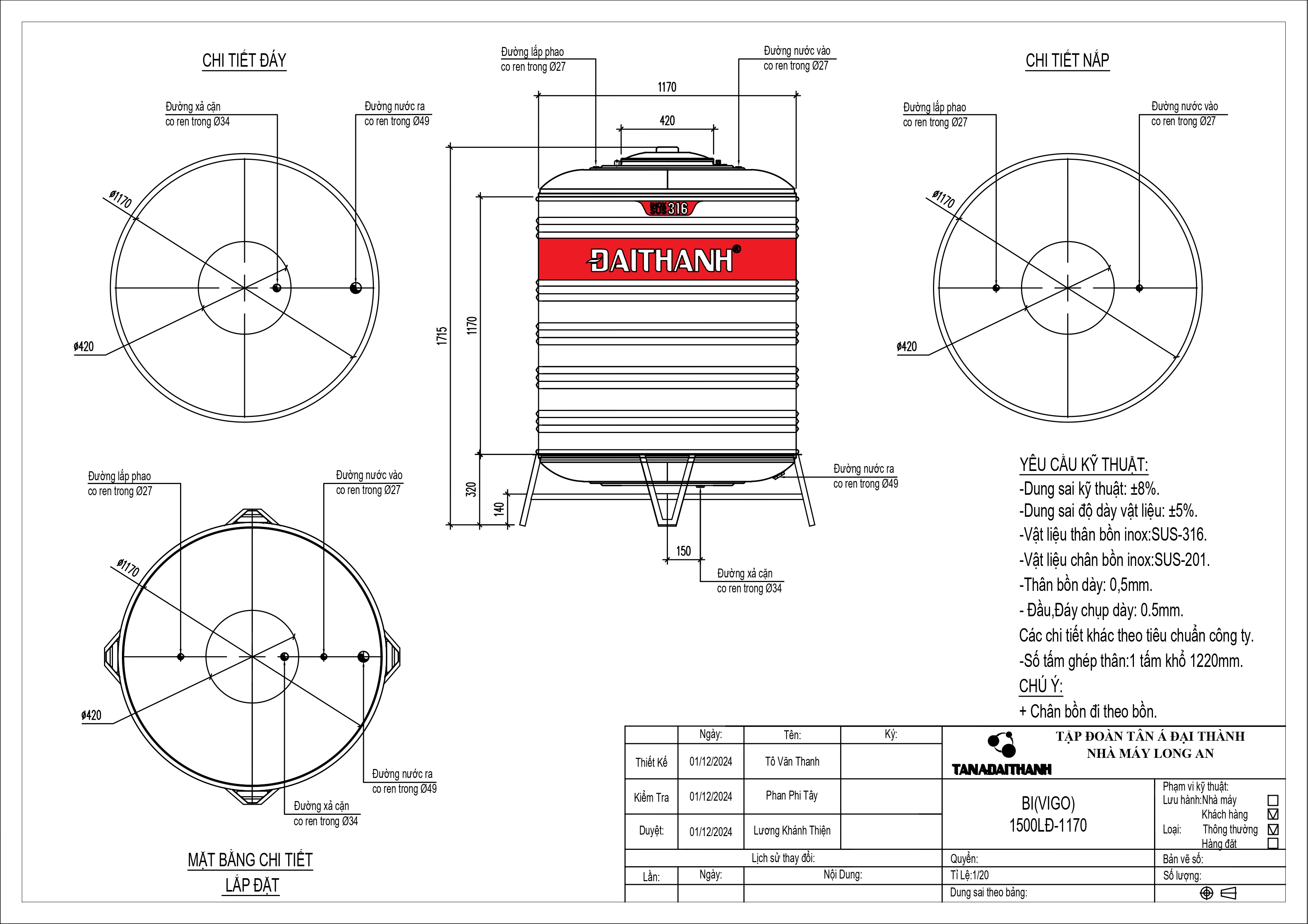 BỒN INOX 316 ĐẠI THÀNH 1.500L ĐỨNG