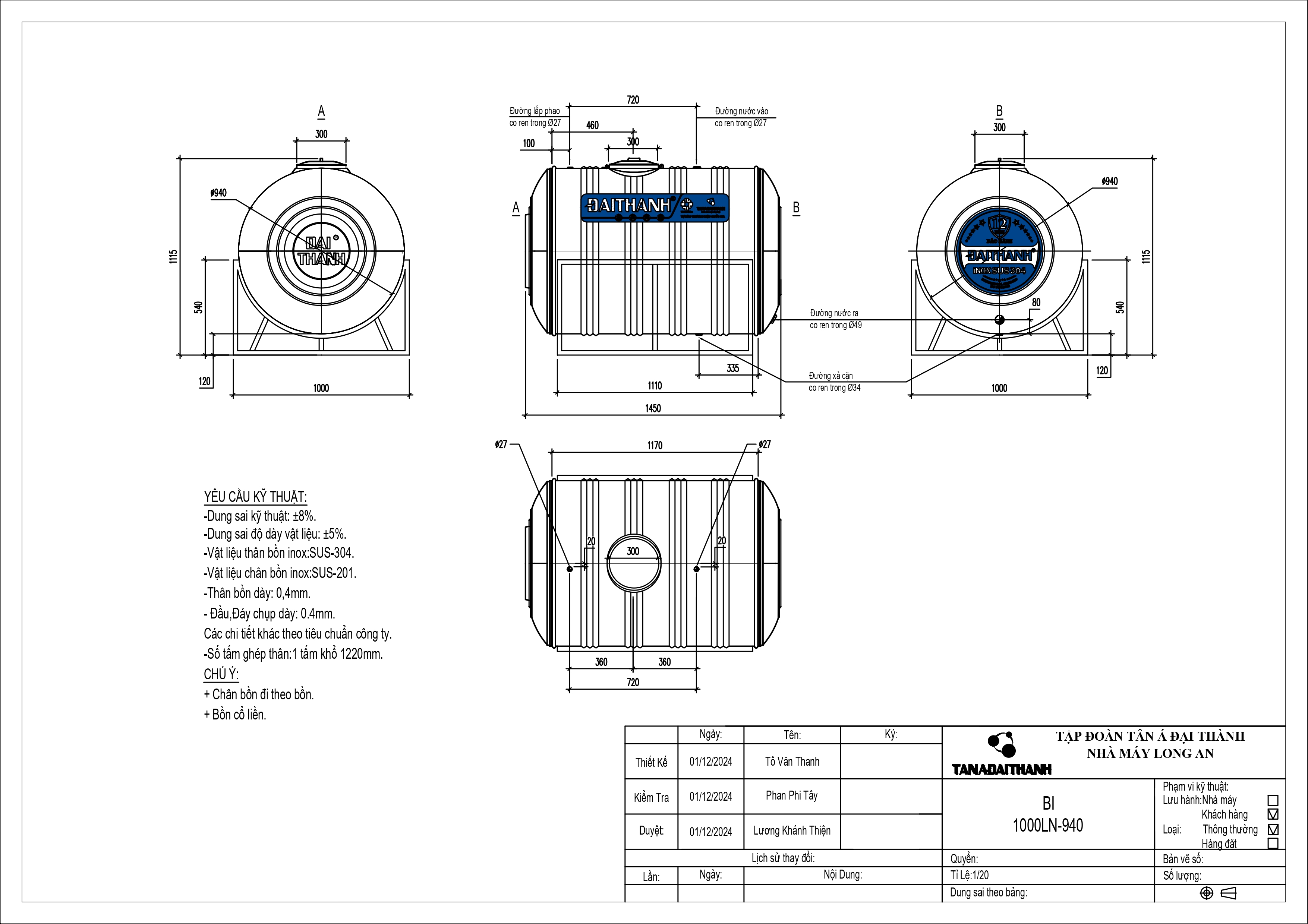 BỒN INOX ĐẠI THÀNH 1.000L NGANG