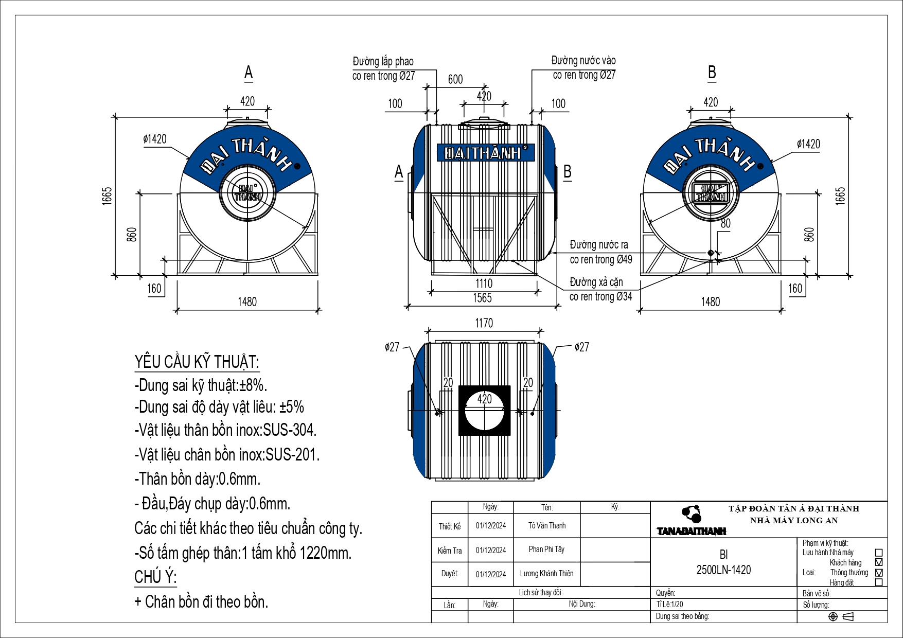 BỒN INOX ĐẠI THÀNH 2.500L NGANG