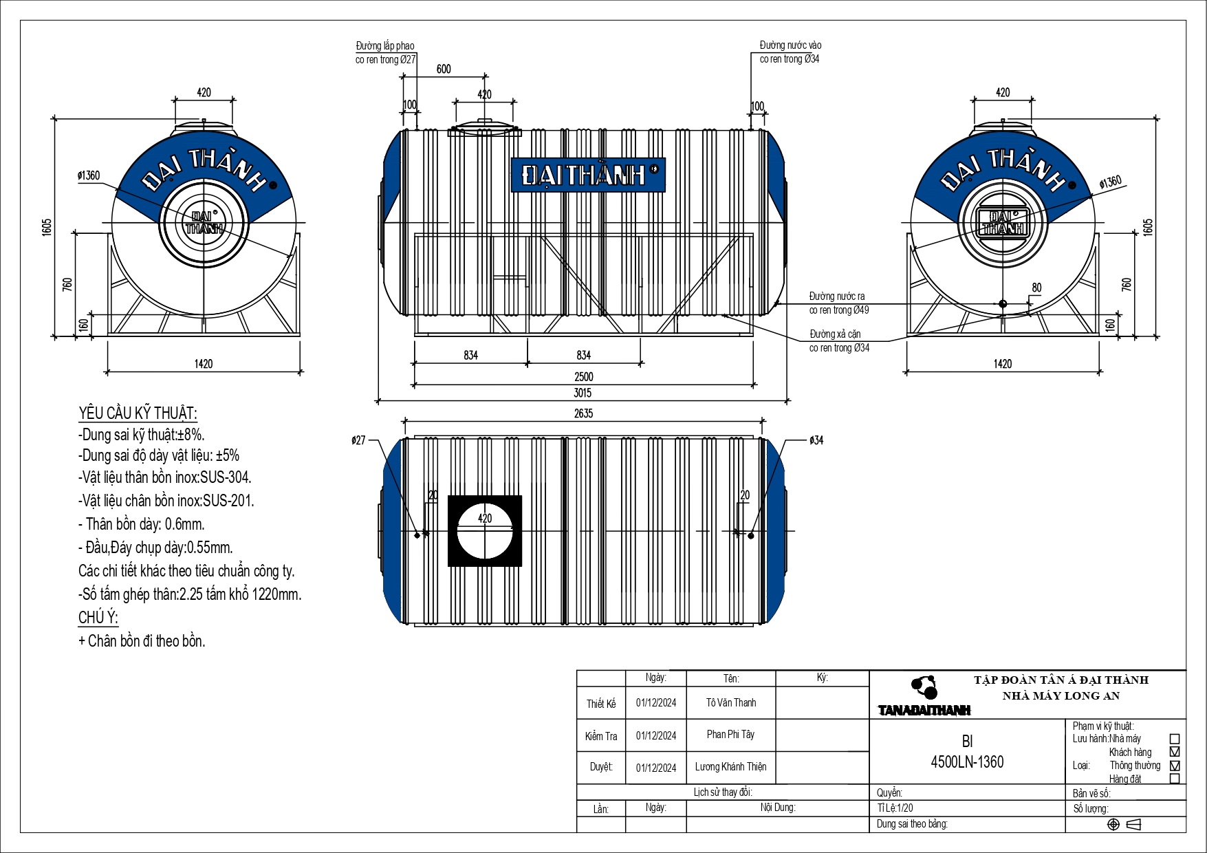 BỒN INOX ĐẠI THÀNH 4.500L NGANG