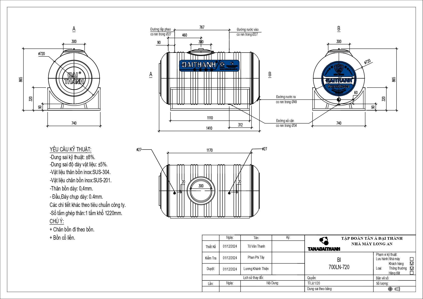 BỒN INOX ĐẠI THÀNH 700L NGANG